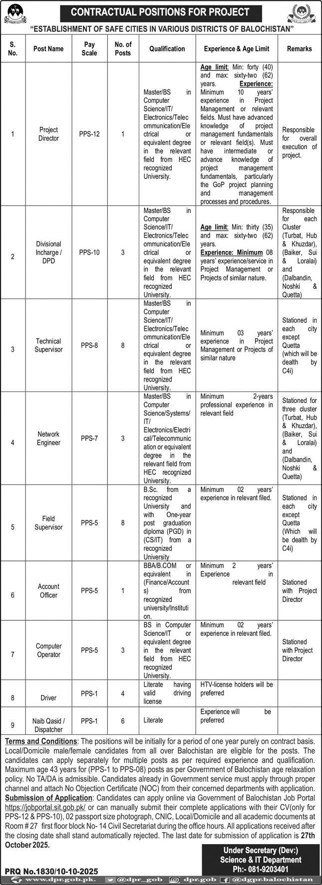 The Safe Cities Authority invites applications for roles to support operations in Balochistan (primarily Quetta). Below are the key details (PPS-01 to PPS-12 scale):